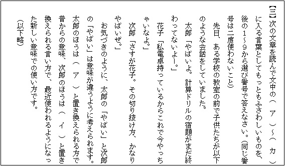 空欄に当てはまる語を選ぶ問題です。このほかにも慶應中等部らしい「ことば」にこだわった問題がたくさん出題されています。単純に言葉の意味を辞書で覚えるだけでなく、日常生活の中で言葉に気を付けているか、伝統の中で言葉に気を付けているかということが問われています。 机に向かう受験勉強が必要なのは言うまでもありませんが、それだけではない多角的な経験や思考が問われている問題です。これが「慶應中等部らしい」国語の問題です。 可能ならば、小5くらいからそのようなことを意識して生活しているだけで、結果は大きく変わるものと思われます。普段の国語の学習の延長線上で対策はできますし、その対策が非常に効果的な学校であるといえます。