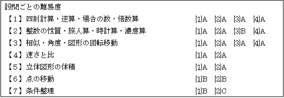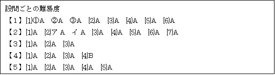 今年度は大問数は5題。小問数は25で,解答箇所は29。例年とほぼ変わりませんでした。出題形式では例年答案は数字のみを記入する形式でしたが,漢字を書かせる出題が2箇所ありました。しかし答えは平易な漢字であり,今後の学習方法に影響はないと思われます。出題内容は例年以上に難問がなく,【4】⑷の文章がやや難解であった程度でしょう。今年も「ミスなく,素早く,確実に」解くことが求められました。以下に設問ごとの難易度を示します。Aは一般的な基本問題,Bは標準問題,Cは応用問題です。