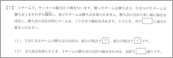 【1】は「四則計算,逆算,場合の数,倍数算」。計算問題2問と簡単な一行問題2問です。【2】は「整数の性質,旅人算,時計算,濃度算」の基本的な文章題が1問ずつ出題されていました。【3】】は「相似,角度,図形の回転移動」。この図形小問も基本的なものばかりです。合格のためには【1】~【3】は全問正解が必須です。【4】は「速さと比」の問題。問題集などで必ず一度は見たことがある問題です。【5】は「体積」の基本問題。相似を上手に使って計算できれば迷うことのない問題です。【6】の「点の移動」の問題は,図形の性質がよく理解できていないと時間がかかってしまったかもしれません。【7】の「条件整理」の問題は問題文の把握と場合分けが効率よくできないと,得点が難しい問題です。