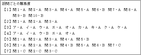 大問数は7題。小問数は20で,例年通りでした。難易度も基本問題が中心で,この点も例年と変わりありません。今年も「ミスなく,素早く,確実に」解くことができたかの高得点の戦いとなりました。以下に設問ごとの難易度をまとめました。Aは一般的な基本問題,Bは標準問題,Cは応用問題をそれぞれ示します。