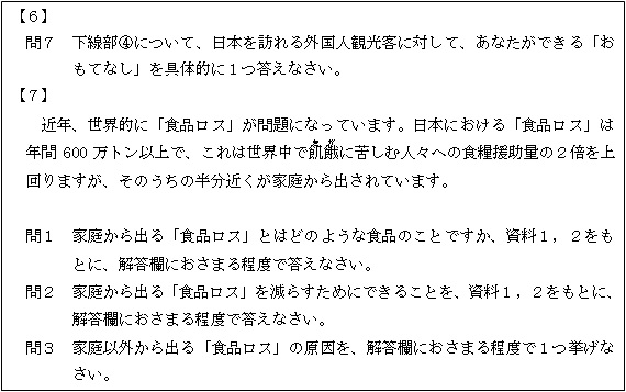 【6】では、2018年に開催された国際競技大会に関する問題が出題されました。2018年は平昌(ピョンチャン)オリンピックとロシアワールドカップが開催された年の入試問題は、時事問題と世界地理の複合問題として出題する割合が高いので、【4】と同様、対策している受験生にとっては有利だったと思います。ただし、問7のような問題は、自分が出来る「おもてなし」について記述させる問題や、【7】の「食品ロス」について記述させる問題は、2018年度入試で出題された【7】の記述問題を踏まえた上で自分なりに対策をしていなければ解けない問題です。まず、この問題を初見で見た時に、多くの受験生は残り時間から逆算して、どのくらいの時間を費やせるのかを考えて解いたのではないでしょうか。ですが、問われている内容は難しくはありませんので、必ず何かしら書くこと重要です。この問題は昨年と同様、最後に「解答欄の枠内おさまる程度で述べなさい。解答する時には、解答欄からはみ出さないように気をつけましょう。」という決まりがあります。これは、文章を要約する力・字の大きさ・字の丁寧さを見るためでもありますので、普段の学習からこの3点を心掛けて取り組む必要があります。