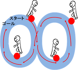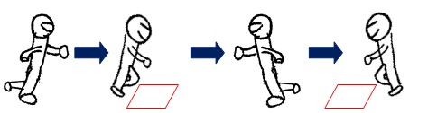 ②真ん中の枠に片足を入れて戻る。再度走って奥の枠に片足を入れて戻る。