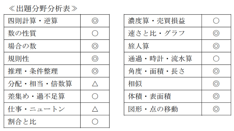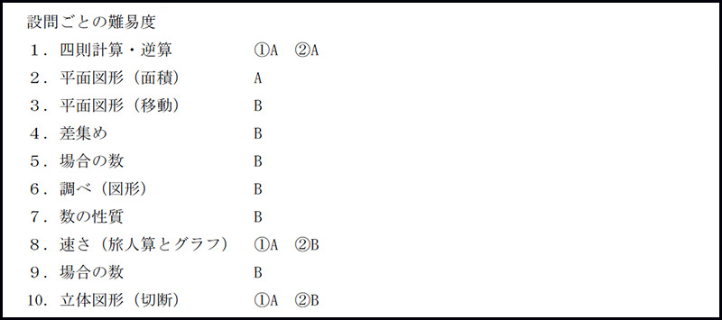 制限時間40分・配点100点・大問10題・小問13題と、ほぼ例年通りの出題でした。以下に設問ごとの難易度をまとめました。Aは一般的な基本問題、Bは標準問題、Cは応用問題となっています。慶應義塾普通部は40分という制限時間内に基本的な易しい問題と、解くのに時間がかかる複雑な問題が混在しており、タイムコントロールが合格するための絶対条件です。