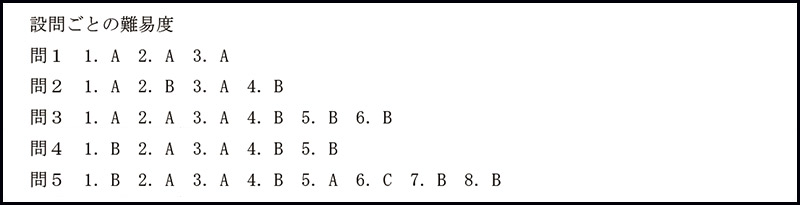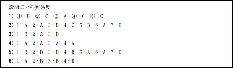 設問の難易度は、易しい問題から高難度のものまで幅広く出題されています。特に、選択肢問題は難易度が高く作られています。根拠を拾ってから、選択肢の一言一句に着目して解かなければならないものが目立ちます。そのため、基礎問題を間違うことなく解き、さらに難易度の高い問題をどの程度得点できるかが合否を分ける試験です。