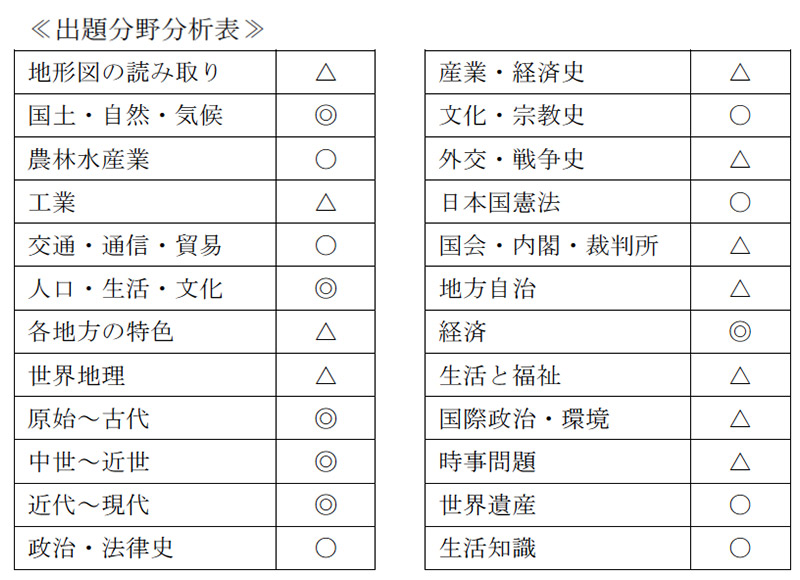 2)は宮城県宮古市を題材にした問題が出題されました。1~6までは、基本から標準レベルの問題ですので、確実に正解しておかなければなりません。また、7では、「津波に強い町」に向けた取り組みとして、2枚の地図を比べて読み取れることを記述させる問題が出題されましたが、本文中に書かれているワードと地図中の密集している住宅地がどこに建てられているのかを探して、記述をすれば良いので、さほど難しくはありません。3)は関東・中部・近畿の3地方に関する統計資料問題が出題されました。最新の統計資料を基にして問題を作成していますので、必ず目を通しておく必要があります。出題内容も2)と同様、基本から標準レベルの問題ですので、確実に正解しておかなければなりません。4)は江戸時代の幕末~昭和時代の戦後までの交通・通信を題材とした歴史問題が出題されました。5)は動物を題材とした歴史問題が出題されました。どちらも傍線部やカッコの前後にヒントとなるワードが隠されていますので、さほど難しい問題ではありません。6)は昨年実施された衆議院議員総選挙の問題が出題されました。国会・選挙に関する問題は、慶應附属校で最も出題される内容ですし、時事問題と絡めて出題されます。国会・選挙が苦手な場合は、早期に把握しておく必要があります。 以上のことから、慶應普通部の合格へのカギは、どの分野においても満遍なく対策をすること。そして、3)で出題されたように、最新の統計資料・グラフ(特に地理分野に関係するもの)なども目を通しておくことが必要です。また、慶應普通部は、他の慶應附属校の中で記述問題の出題が多いです。そのためには、普段の学習から一つの社会用語(人名・地名・出来事など)から沢山のキーワードを導き出す訓練(点と点から一つの線にする訓練)をしておきましょう。
