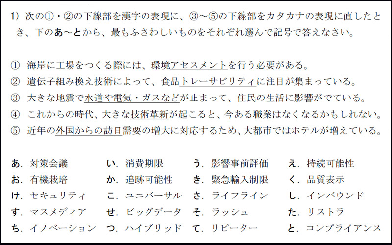 1)は地理分野と公民分野の総合問題が出題されました。出題内容は、①・②はカタカナの表現を漢字の表現に、③~⑤は漢字の表現をカタカナの表現に直したとき、正しい答えを記号で選ばせる問題でした。ポイントは、1)からCの応用問題が出題されたということです。大抵の社会科入試では、出題される内容ではないので、殆どの受験生が躓いたと思われます。1)に1分以上考えてしまったら、その問題は飛ばしましょう。試験時間が25分という短い時間で全部の問題を解き、見直しまで終了しなければなりません。1)は、時間配分を自分で考えて解く上で良い問題であると思われます。