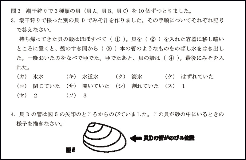 元気なアサリは流水で洗うと口を閉じます。口を開いた貝などの死んだ貝を取り除き、容器に並べ、貝の頭が少し出るくらいまで海水や塩水を注ぐ。暗いところに一晩置き、塩抜きをする。そのような下処理の後、あさりの味噌汁が作られて行く。このような経過や現象への興味を大切にしているか?日々の身の回りの様々な出来事などを理科的な視線で見渡せば、いろいろなものが見えて来ます。4.のようなイラストは、実物や写真などを目にしているかどうかが決め手となります。 記述は毎年必ず数題出題されます。回答欄には字数が示されていますから、このような形式で良く練習して置く必要があります。