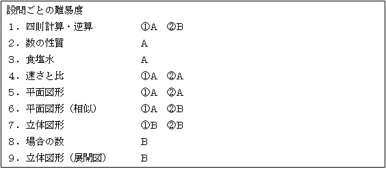 制限時間40分・配点100点・大問9題・小問15題と、昨年より大問数が1題減りましたが小問数が2題増え、全体的には例年通りのボリュームとなっています。問題難易度は昨年度に比べ、やや易しくなった印象です。以下に設問ごとの難易度をまとめました。Aは一般的な基本問題、Bは標準問題、Cは応用問題となっています。慶應義塾普通部は40分という制限時間内に基本的な易しい問題と、時間がかかる複雑な問題が混在しており、タイムコントロールが合格するための絶対条件です。
