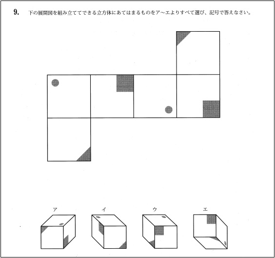 投影図や展開図を使った問題はよく出題されます。問題文から、正しくイメージが持てるような問題演習を行い、準備しておくと、混乱しないで正解できます。