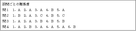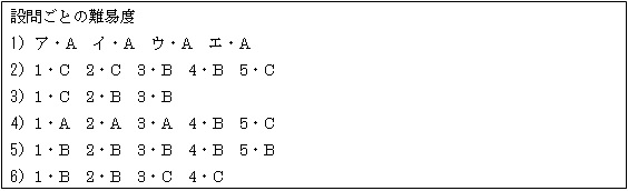 今年度は大問数4,解答箇所42と,昨年と比べ大問数は1つ減りましたが,解答箇所はほぼ同数でした。30分という試験時間を考えると易しい試験ではありません。出題レベルは基本的なものから標準的なものがほとんどでしたが,やや複雑な計算問題,記述問題および図示して答える問題も出題されていました。記述問題は過去4年は毎年出題されていますが,図示する問題はここ10年で初めてです。以下に設問ごとの難易度をまとめました。Aは一般的な基本問題,Bは標準問題,Cは応用問題をそれぞれ示します。