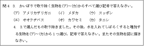 3.は外来生物が解答になります。かいぼりの目的の一つがもともとその場所にいなかった生物を取り除き,従来の生態系を取り戻すことであることを考えれば,すぐに判断できたはずです。メダカ,スッポン,カワセミ,タニシは在来種です。4.は食物連鎖を考えられれば解答できます。アメリカザリガニとオオクチバスが捕食する生物ですからメダカになります。問2が図示して答える問題です。こん虫の図は,描くのは難しくはないと思いますが,問題文の中にたくさんの指示が出ています。その指示に忠実に,また不足することなくこたえなければなりません。問題文を読むことは基本中の基本ですが,早実の入試でも当たり前のようにしなければなりません。