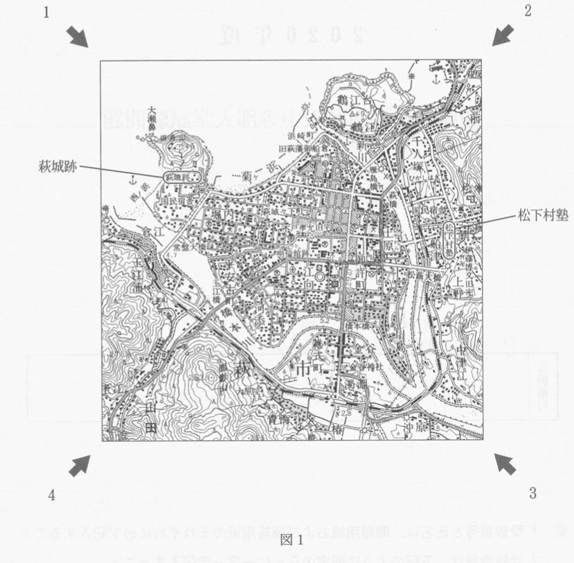 【1】 図1は1/50,000地形図「萩」より作成したものです。地図の方位は上が北で拡大縮小はしていません。問いに答えなさい。