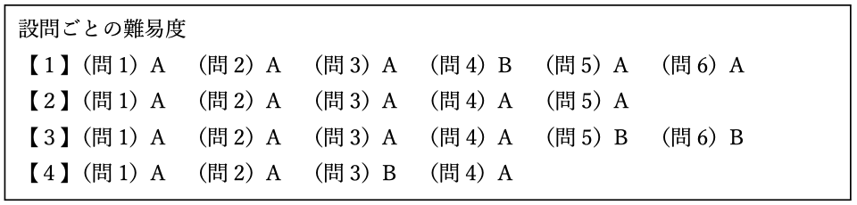制限時間45分・配点100点・大問6題・小問18題と、ほぼ例年通りの出題でした。問題難易度は昨年に比べやや易しくなった印象です。以下に設問ごとの難易度をまとめました。Aは一般的な基本問題、Bは標準問題、Cは応用問題となっています。