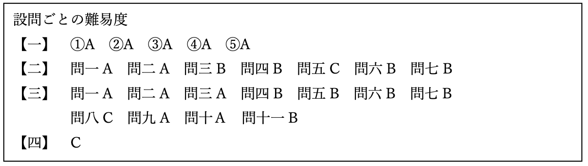 制限時間45分・配点100点・大問6題・小問18題と、ほぼ例年通りの出題でした。問題難易度は昨年に比べやや易しくなった印象です。以下に設問ごとの難易度をまとめました。Aは一般的な基本問題、Bは標準問題、Cは応用問題となっています。
