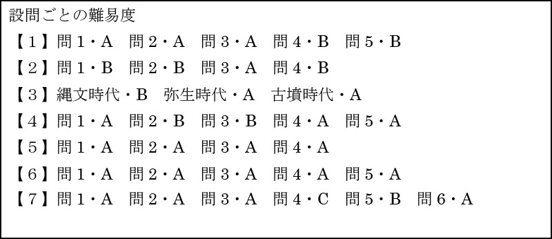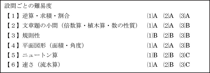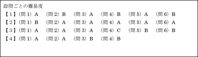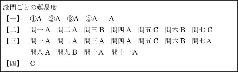 制限時間45分・配点100点・大問6題・小問18題と、ほぼ例年通りの出題でした。以下に設問ごとの難易度をまとめました。Aは一般的な基本問題、Bは標準問題、Cは応用問題となっています。今年は受験生を困らせるような、複雑な問題は少なかったので、いつも以上に高得点勝負になったようです。