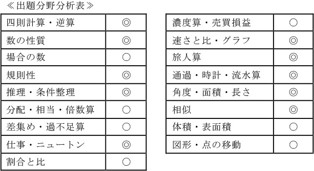 まず【1】の3題及び、【2】の(1)(2)は基本的な問題です。緊張せず、焦らずに正解することが必須です。【2】の(3)は与えられた数字の性質と、問題文の条件を整理して解く問題です。丁寧に考え、条件を整理していくと正解できます。ここで時間を必要とする分、それ以前の5題は迅速に処理する必要があります。【3】は規則性の問題です。今年の規則性の問題は、規則を見つけ、数え上げることができれば、難無く全問正解できる問題でした。本校の規則性の問題は、時間がかかる難解な問題が頻繁に出題されてきたので、しっかりと対策してきた受験生にとっては今年の問題は易しく感じたのではないでしょうか。【4】は与えられている条件と、図形の基礎知識を使って考えると、(1)(2)は時間をかけずに正解できる問題。(3)は(1)(2)を含め、検討した結果を使って丁寧に考えていく問題です。面積の「~倍」を問う問題は平面図形の定番問題なので、類題演習で対策をしておくとよいでしょう。【5】は、一見立体図形の問題のように思えますが、よく問題文を読むと、ニュートン算です。それに気づくと、解き方も思いつくはずです。(1)から題意に沿って考えていくと(3)まで解ける問題です。【6】は流水算の問題です。「時間が足りなくて手が出せなかった」となるのはもったいない問題です。自分で図やグラフを書いて、(1)(2)は正解してほしい問題です。