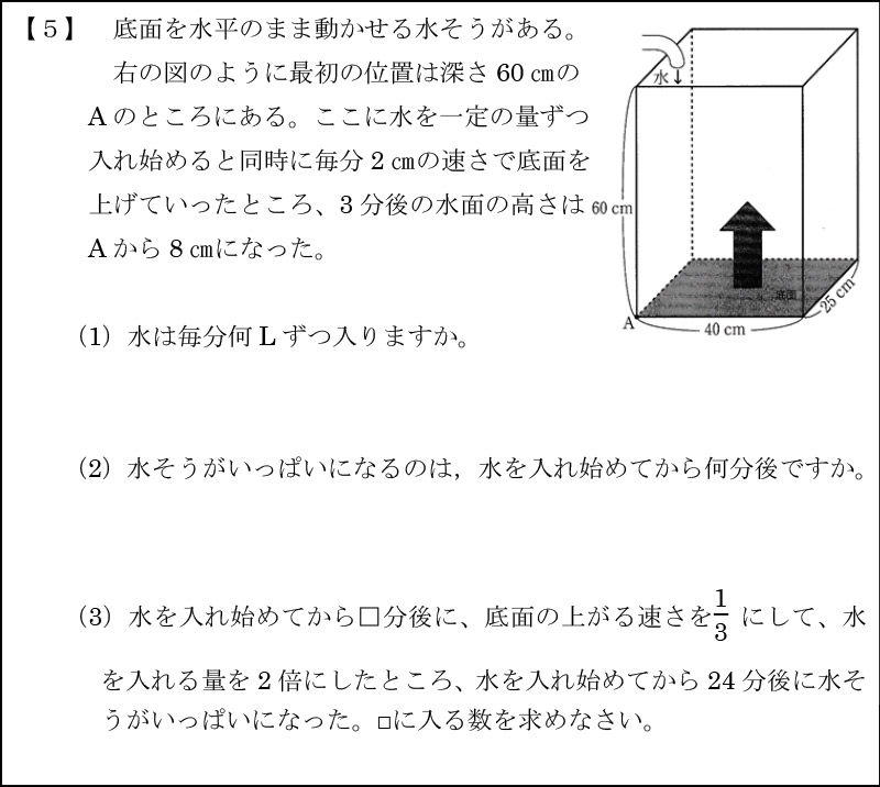 今年の一問は【5】立体図形のニュートン算です。解き方が定着できていれば、丁寧に思考を重ねて正解にたどり着けている問題でした。 慶應義塾湘南藤沢の攻略のカギは問題処理能力と、数のセンスです。それらを養うには全範囲の標準レベルの問題を一定時間で解けるように繰り返し練習することです。その際にランダムに出題されている問題を、毎日時間を決めて演習を行うとよいでしょう。また規則性の色々な問題に数多くあたり、解法パターンを覚えましょう。さらに毎年のように出題されている速さの問題や平面図形の問題は、難問でなくていいので、時間がかかる複雑な問題に挑戦し、必ず正解できるまで挑戦していくと効果的です。