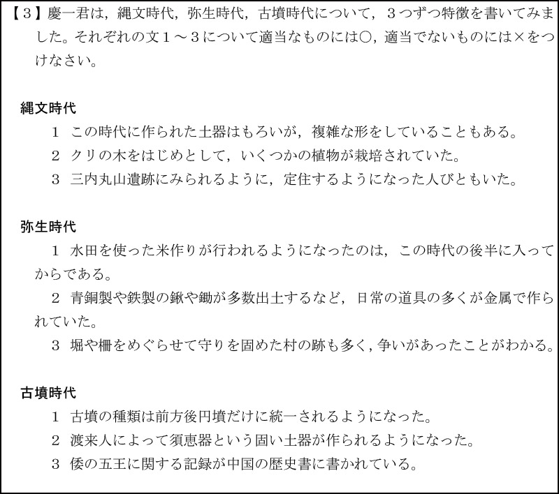 【1】は自動車を題材にした問題が出題されました。問1・問2は、最新の統計資料の読み取り問題が出題されています。普段の学習で最新の統計資料を目にした受験生にとっては、有利な問題です。問3以降は、記号選択問題・書き取り問題など幅広く出題されていますが、問題の難易度は基本から標準レベルですので、確実に正解しておかなければなりません。【2】は日本国内の新幹線に関する問題が出題されました。こちらも【1】と同様、最新の統計資料を使った読み取り問題が大半です。【3】は縄文時代・弥生時代・古墳時代の特徴について出題されました。ここでは、各時代の特徴が3つずつ書かれており、それぞれの文について正しいものには○、誤っているものには×を答えさせるという内容でした。湘南藤沢では、例年このような形式で出題されます。必ず設問の前後にヒントとなるワードが書かれていますので、設問を細部まで読み取る力が必要です。普段の学習から意識して問題に取り組んでいる受験生にとっては、有利だったと思います。