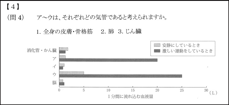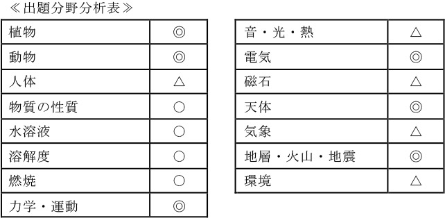 【1】は「川原の石の分布」についての観察結果から考察する問題でした。調査結果のグラフを読み取る問題は丁寧に解く必要があります。【2】は「気体の発生」の問題でした。レベルは決して高くないのですが、問3~5は「すべて選びなさい」形式であったため、戸惑った受験生も少なからずいたはずです。【3】は「てんびん」の問題。設定された条件に沿って、試行錯誤しながら正確に計算できなければなりません。少し難易度が高い問題でした。【4】は「ヒトの体」。心臓と肝臓を解答用紙に描き入れる問題が出題されました。位置関係を大まかに把握しているだけでは自信をもって答えられなかったでしょう。また、成人男性の安静にしているときと激しい運動をしているときの血流の違いをグラフから連想させる問題が出題されました。