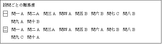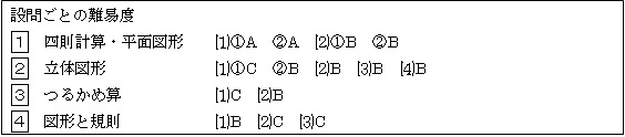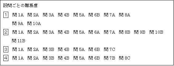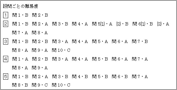昨年は6つの単元から出題されていたのに対して,今年は大問こそ4題と変わりませんでしたが単元が4つという出題構成に変わりました。小問は36題と昨年とほぼ同じでしたが,単元が少なくなったからか,若干の難易度の上昇が見られました。受験生にとっては解きづらい問題もあったはずです。計算を必要とする問題の割合もやや高く,正確かつ迅速な計算が必要とされました。以下に設問ごとの難易度をまとめました。Aは一般的な基本問題,Bは標準問題,Cは応用問題をそれぞれ示します。