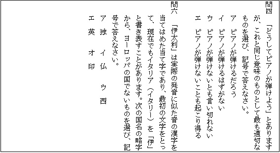 知識事項の問題を大問二から二つ挙げました。 一つ目は反語表現を知っているかという問題です。小学生でも出来てほしい一方、分からない生徒もたくさんいるだろうというところを見事に出題しています。小学生にとっては少し背伸びをした難しい文章をどのくらい読んでいるか、また、読んだときに分からない表現をわかるようにしているかという普段の学習が問われています。 二つ目は国名の漢字表記を知っているかという問題です。漢字検定などではおなじみですし、社会の授業でも多かれ少なかれ触れていると思います。とはいえ、「西」など小学生にはちょっと難しい国(とはいっても、確実に社会では学習している国)が出題されており、他の強化も含めて漢字を理解して使っているかが問われている問題だと言えます。