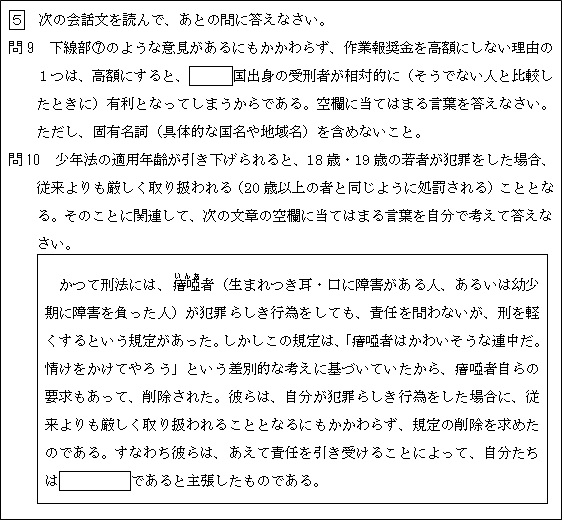 5は成人年齢に関する会話文の問題が出題されました。問1~問8までは、基本~標準レベルの内容で出題されていますので、受験生の大半が解けたのではないかと思われます。しかし、問9・問10の問題は、本文や設問の内容を参考にするだけではなく、自分なりに考えなければ解けない問題です。