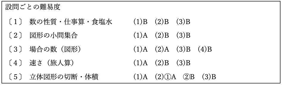 制限時間50分・配点60点・大問5題・小問17題と、昨年に比べ2題増えましたが、内容はほぼ例年通りの出題でした。以下に設問ごとの難易度をまとめました。Aは一般的な基本問題、Bは標準問題、Cは応用問題となっています。例年通り、まずは最初の数の性質の問題をスムーズに解けるかどうかで、合格不合格が決まってしまうといっても過言ではありません。数の性質の問題で時間をかけ過ぎ、後半の大問で、思ったように時間を使えず、解ける問題を落としてしまった、悔しい思いをした受験生が多かったようです。