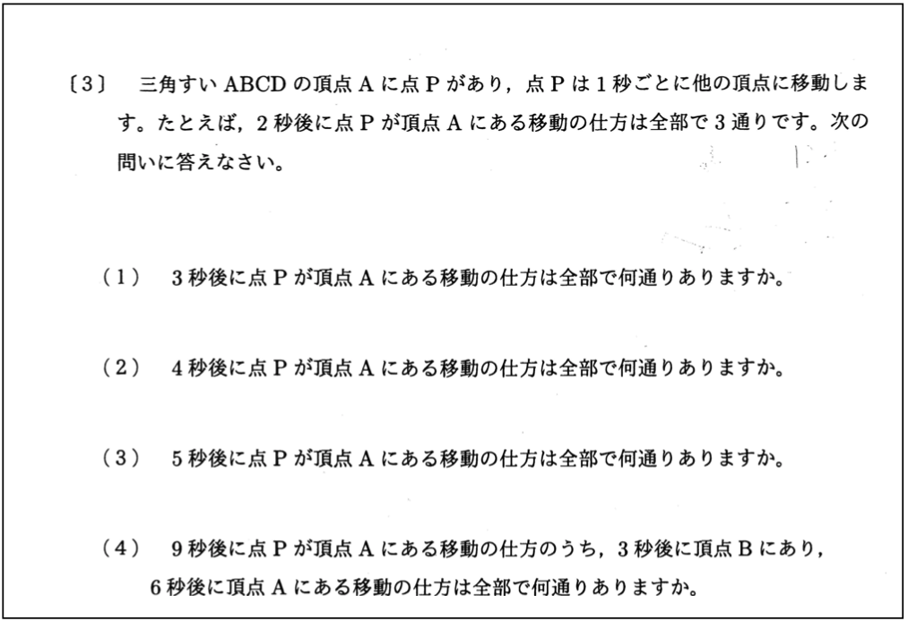 与えられた問題文から自分で三角すいABCDを描いて、時間経過の条件ごとに場合分けして考えていくと、さほど難しい問題ではありません。(4)は条件整理に時間がかかるかもしれませんが、上手に整理して得点したい問題です。
