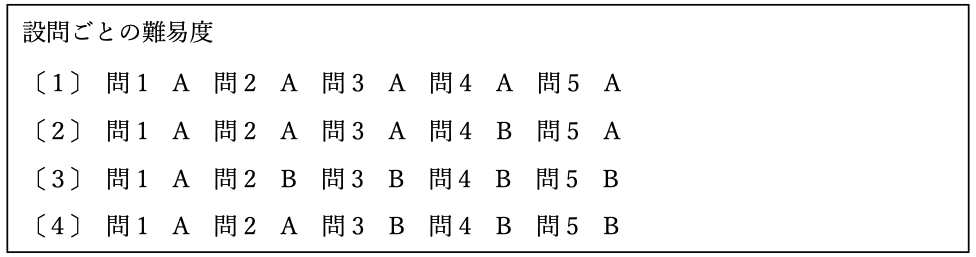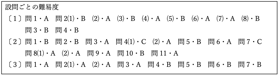 大問数3題・小問数32題と例年通りです。以下に設問ごとの難易度をまとめました。Aは一般的な基本問題、Bは標準問題、Cは応用問題をそれぞれ示します。早稲田中学校合格のためには、AとBの問題は確実に正解しておかなければなりません。
