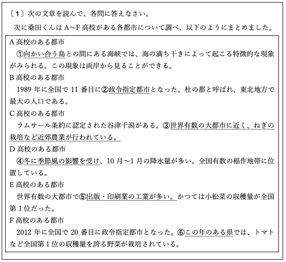 〔1〕は高校野球を題材とした地理の問題が出題されました。問題の難易度は、基本~標準レベルですが、問4で出題されたように早稲田中学校が初めて作図問題が出題されました。内容としては、該当する高校がある都道府県を全て塗りつぶすだけですので、さほど難しくはありませんが、問題文から読み取れる情報や設問に隠されているヒントを読み取らなければいけまんので、受験生の多くは、多少手間取ったのではないかと思います。