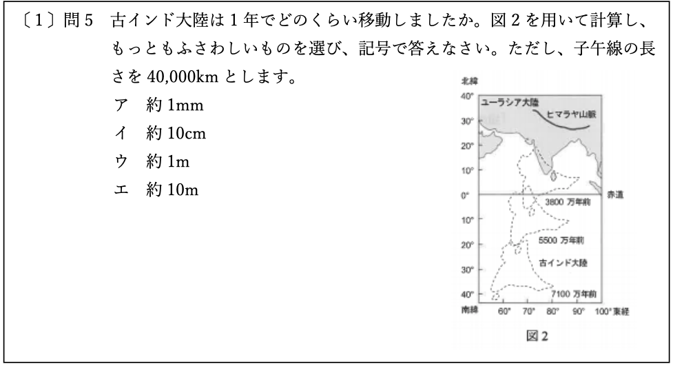 〔1〕は「化石・大地の変化」の問題でした。示準化石や大陸の移動に関する知識問題に加え,古インド大陸の移動速度を計算させる問題が出題されていました。この計算問題は難しくはないのですが,位や単位など慎重さが要求されています。