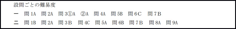 大問数は4、解答箇所は25と例年通りの出題でした。物理・化学・生物・地学の各分野から1題ずつ出題されている点も変わりありませんでした。いずれの問題も受験勉強の中で見たことのある典型的な問題ですが、化学分野と物理分野は複雑な計算こそありませんでしたが、神経を集中してじっくり考えなければ解けない問題が後半部にかなりありました。解答形式は記号選択が中心ですが、15字以下の記述などもありました。以下に設問ごとの難易度をまとめました。Aは一般的な基本問題、Bは標準問題、Cは応用問題をそれぞれ示します。