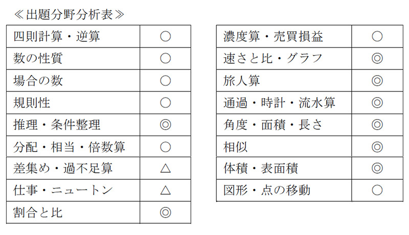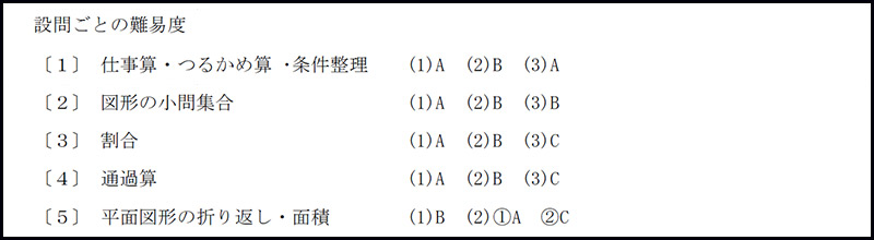 制限時間50分・配点60点・大問5題・小問15題と、ほぼ例年通りの出題でした。以下に設問ごとの難易度をまとめました。Aは一般的な基本問題、Bは標準問題、Cは応用問題となっています。今年は、最初から算数のセンスが問われた問題でスタートし、前半に時間をかけ過ぎ、後半の大問で、思ったように時間を使えず、解ける問題を落としてしまった、というタイムコントロールに苦労した受験生が多かったようです。