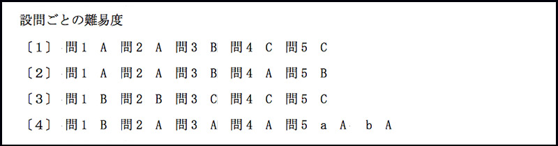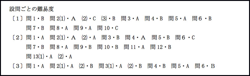 大問数3題・小問数40題と例年通りです。以下に設問ごとの難易度をまとめました。Aは一般的な基本問題、Bは標準問題、Cは応用問題をそれぞれ示します。早稲田中学校合格のためには、AとBの問題は確実に正解しておかなければなりません。