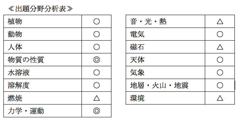大問〔2〕は食物連鎖の基本問題ですが、仕組みをよく理解していることと外来生物についての知識があることが試されました。大問〔3〕は物質の区別の典型的な問題パターンですが、特に後半部は「2種類が溶けた」「1種類が沈殿した」などの言葉に注意し、落ち着いてていねいに考えなければ正解は難しかったかもしれません。大問〔4〕は昼夜と季節での風の吹き方についての基本問題です。ただし、15字以内の記述は練習が必要です。 早稲田中学校の入試問題は実験観察を基にした問題が多く出されます。この学校の問題に対応するためには、日頃から、「なぜ」そうなるのかを考える習慣をつけて置くことと、この種の問題を多く練習して、考え方や解き方に習熟することが必要です。合否は、じっくり解くべき問題をどの程度正解できるかにかかっていますから、基本問題は迅速かつ正確に解き進め、時間を確保する必要があります。