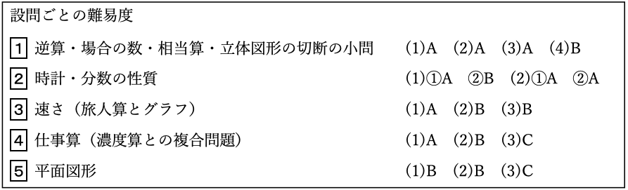 制限時間60分・配点100点・大問5題・小問15題と、ほぼ例年通りの出題でした。以下に設問ごとの難易度をまとめました。Aは一般的な基本問題、Bは標準問題、Cは応用問題となっています。長文や資料を正確に読み解いてその場で思考を積み重ねていく問題が毎年出されるのが早稲田実業の特徴ですが、今年は、昨年に比べ解きやすい問題が全体的に増えたようです。