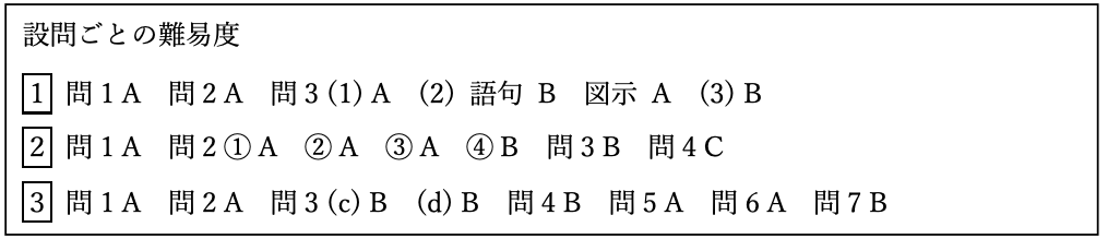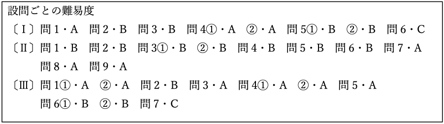 今年度は大問数3,解答箇所21と,昨年と比較して大問数は変わらず,解答箇所はやや増加しています。出題レベルは基本的なものから標準的なものがほとんどです。しかし,記述問題および図示して答える問題も出題されていて,その準備は不可欠だったでしょう。以下に設問ごとの難易度をまとめました。Aは一般的な基本問題,Bは標準問題,Cは応用問題をそれぞれ示します。