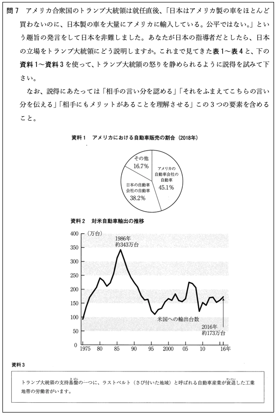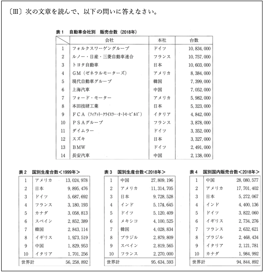 〔Ⅰ〕は日本国憲法を題材とした問題が出題されました。ここでは、記号問題・用語記入問題・地図の読み取り問題と記述問題が幅広く出題されています。問9の「2019年6月に起きたタンカー攻撃事件のあったホルムズ海峡の場所を答えさせる問題」は、テレビやニュース・新聞を見ていなければ解けない問題が出題されていますが、それ以外の問題難易度は基本から標準レベルなため、高得点が取れたと思います。〔Ⅱ〕は「ある人物」が自分の生まれ育った“ふるさと”を説明した歴史の問題が出題されました。問題の難易度は、全て基本~標準レベルの問題ですので、確実に正解しておかなければなりません。ただし、設問の中には、選択肢の中から正しいものをすべて答えさせる問題も出題されていますので、設問を注意深く読み取る力が必要です。〔Ⅲ〕は「世界の自動車会社別販売台数」を題材とした問題が出題されました。設問の全ては、本文の読み取りとグラフ・表の読み取り問題です。この問題は、資料の読み取りが合否を分けるポイントとなっています。データ資料・図表の読み取りが苦手な場合は、早期に対策をする必要があります。特に、問7の「あなたが日本の指導者だとしたら、日本の立場をトランプ大統領にどのような説明をして、トランプ大統領の怒りを説得するか」を記述される問題は、受験生の大半が多くの時間を費やしたことと思われます。この問題が分からなければ、自分が解ける問題にうつりましょう。時間の使い方が試される上で、非常によい問題です。