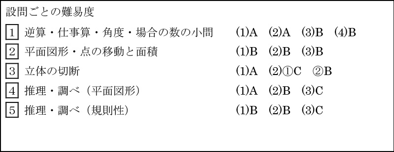 制限時間60分・配点100点・大問5題・小問16題と、ほぼ例年通りの出題でした。以下に設問ごとの難易度をまとめました。Aは一般的な基本問題、Bは標準問題、Cは応用問題となっています。本年度は少し長めの問題文や資料を正確に読み解いていく、受験生泣かせの問題が毎年出されるのが早稲田実業の特徴ですが、今年も数題出題され苦戦した受験生が多かったようです。