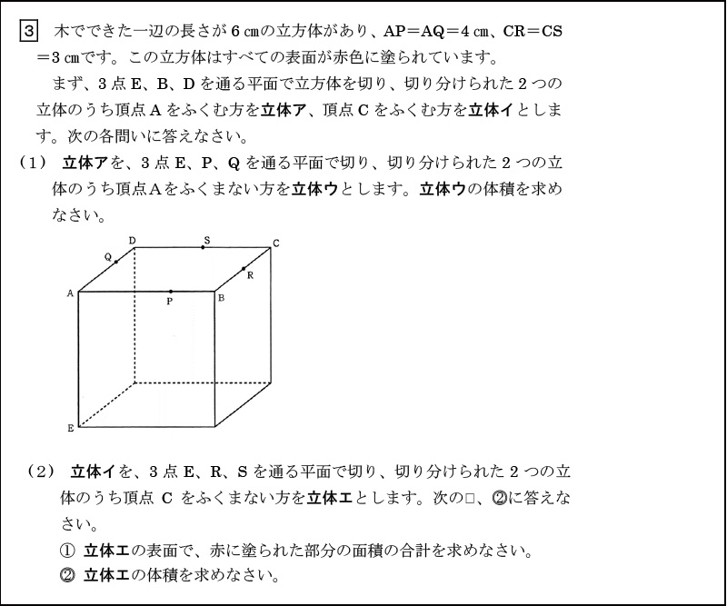 まず1の4題は、時間をかけずに全問正解が必至です。特に平面図形の角度や面積を求める問題は、与えられた図を見た瞬間に、工夫して解くプロセスが浮かんでくるようになるようになるまで、徹底した問題演習でセンスを磨いておくとよいでしょう。次に2の点の移動の問題は、正しくイメージできるかどうかです。特に(3)の作図問題は、円を描くイメージが持てれば、易しい問題となり、正解できる問題でした。3は立方体の切断の問題で、(1)は基本レベルなので、正解が必至。切断の様子が正しくイメージできると、平面図形や立体図形の基礎知識を使って解ける早稲田実業らしい問題です。(2)の①はやや複雑な問題です。立体の問題はイメージし、図示できれば解答の糸口が見えてきます。丁寧に解きこむ練習が必要です。②は標準レベル。計算ミスしないように得点したい問題です。4は数の性質や、推理の要素を含む問題。縦と横の長さに注目して整理していくと、(2)まではスムーズに解ける問題です。5は一見難しそうに感じられますが、「空」の動きの規則を見つけ、丁寧に考えていくと、時間はかかりますが全問正解できる問題でした。 今年の1題は3の立体図形の切断の問題です。切断の基礎知識と、イメージが正しく持てれば、(1)は時間をかけずに正解できます。