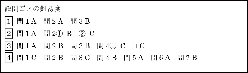 今年度は大問数4、小問数16、解答箇所21で、昨年と比べ大問数は変わりませんが、解答箇所が少し減りました。解答形式は記号選択が大半で、他に30字以上50字以内の記述問題が出題されていました。出題内容も出題レベルも標準的なものがほとんどでしたが、一方で社会や科学への幅広い関心と問題意識が必要なものも出題されており、その分野への対策ができていたかどうかは合否に影響したかも知れません。以下に設問ごとの難易度をまとめました。Aは一般的な基本問題、Bは標準問題、Cは応用問題をそれぞれ示します。