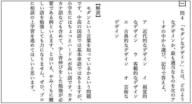 大問数3題、小問数22題と、ほぼ例年通りの問題数でした。大問3が詩・短歌・俳句ではなく、知識事項の出題というのは定着したようです。文章量からみても、60分の試験時間を考えると、適切なボリュームです。