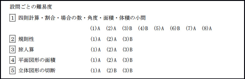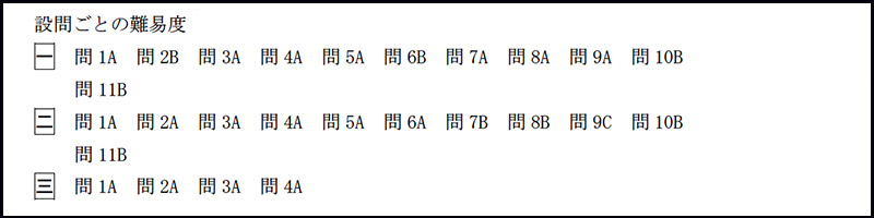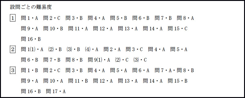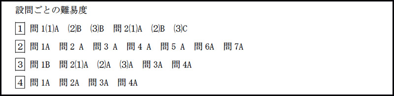 制限時間60分・配点100点・大問5題・小問20題と、ほぼ例年通りの出題でした。以下に設問ごとの難易度をまとめました。Aは一般的な基本問題、Bは標準問題、Cは応用問題となっています。前年度よりも、全体を通して比較的解きやすくなったようです。基本から標準レベルの問題が、バランスよく出題されていました。60分の試験時間から、丁寧に考え、再度見直す時間は十分にあったと考えられます。