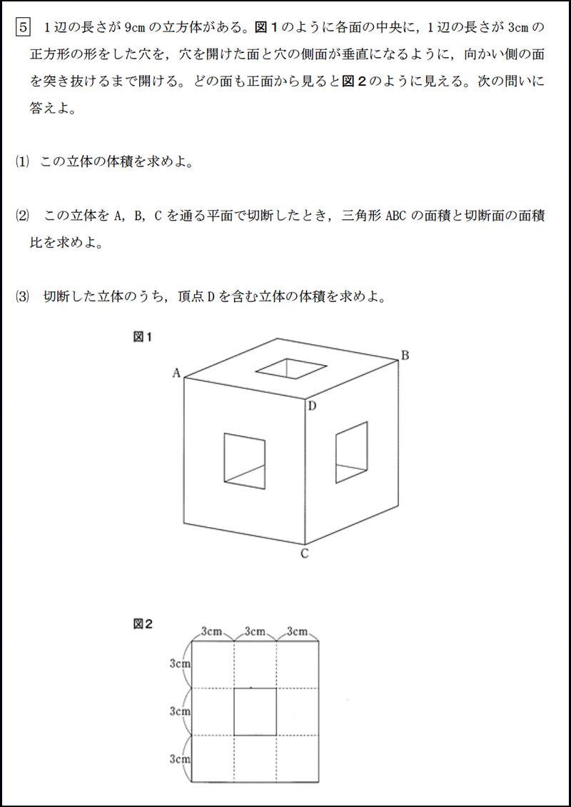まず〔1〕の8題は、基本的な問題がほとんどですが、中にはちょっとひねった、問題文を丁寧に読まないと、時間がかかってしまう問題が含まれているので要注意です。範囲の偏りはなく、毎年色々な分野が出されるので、すべての範囲に対応できるように、準備しておきましょう。もちろん、全問正解が必至です。次に〔2〕の問題は、与えられた式を見て、等差数列の公式を使えばいいと、気付くことができると、とてもやさしい問題に感じられます。計算ミスなく3題ともに、全問正解できる問題でした。〔3〕は旅人算と比の問題。図を描くと問題全体のイメージが持てます。基礎知識の定着がカギになります。〔4〕は平面図形の辺の長さと面積比の問題。(1)は時間をかけずに正解できます。ただ、(1)→(2)→(3)と、前の問題の答えを使って次の問題を解くようになっているので、(1)を間違うと大問すべて失点してしまう危険性があります。ですから(1)は基本的な問題ですが、とても重要です。(2)、(3)は比や相似の知識をフル活用し、スマートに解く練習をしておくと良いでしょう。〔5〕立体図形の切断の問題です。切断のパターンは基本の3点なので、ほとんどの受験生は切断のイメージが正しく持てたと思います。(1)は立方体の中の空洞になっている部分が正しくイメージできれば、あとは計算力。(2)(3)は、与えられた図2を上手に使いこなせると、解法の糸口が見えてきます。 今年の一題は〔5〕です。図2の使い方に気付くと、解きやすくなります。切断のイメージと合わせて考えると良いでしょう。