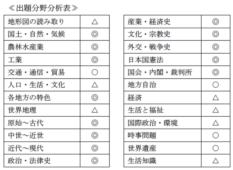 大問数3題・小問数47題と例年通りです。また、早稲田佐賀は、毎年必ず「九州地方に関係のある問題」が出題されますので、普段の学習から対策をしておく必要があります。以下に設問ごとの難易度をまとめました。Aは一般的な基本問題、Bは標準問題、Cは応用問題をそれぞれ示します。早稲田佐賀合格のためには、AとBの問題は確実に正解しておかなければなりません。