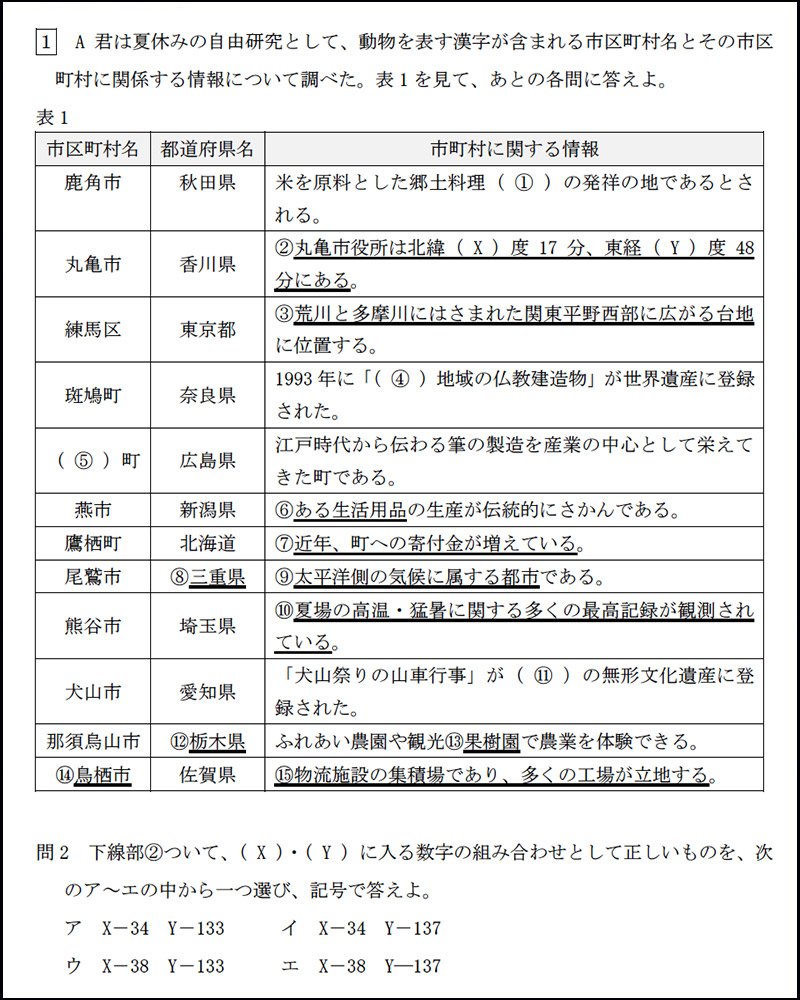 〔1〕は「動物」を表す漢字が含まれる市町村を題材にした地理問題が出題されました。早稲田佐賀中学校は試験時間が40分あり、他の中学校よりも試験時間は長くなっています。ですが、解答数が多いので、上記の問題に多くの時間を費やすと、たちまち試験は終わってしまいます。この問題に直面した場合、この表に書かれている情報を瞬時に見つけましょう。イメージは、クイズを解くような感じです。ちなみに、今年度の場合では、問題文に「動物」と最初から書かれていますが、例年は、設問で表に共通する内容は何かを答えさせる問題が出題されています。また、大問毎に必ず難問が出題されます。今年度で言えば、丸亀市の緯度・経度を答えさせる問題です。分からなければ、自分が解ける問題にうつりましょう。時間の使い方が試される上で、非常によい問題です。〔2〕は人権を題材にした公民問題が出題されました。問題の難易度は、基本レベルから標準レベルの問題が大半ですので、多くの受験生が取れたと思われます。また、2も1と同様、難問が出題されています。今年度で言えば、問9(2)のグラフを見てわかることを記述させる問題が出題されましたが、グラフを細部まで読み取れば必ず解ける問題ですので、焦る必要はありません。〔3〕は各時代の鉄と人々の暮らしに関する歴史問題が出題されました。問2以外は、難易度も基本問題・標準問題レベルですので、高得点が取れたと思われます。問2は、熊本県にある古墳の名前を答えさせる問題が出題されました。まさに、早稲田佐賀の特徴である「九州地方に関係のある問題」です。九州地方の地理・歴史が苦手な場合は、早期に対策をする必要があります。