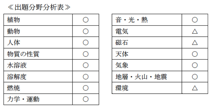 今年度は大問数4、小問数17、解答箇所28で、昨年と比べ、大問数・解答箇所ともに変化ありませんでした。解答形式は数値を求めるものや語句を記入するものが多く、選択形式はやや少なめで、「すべて選ぶ」形式も出題されました。記述は出題されていませんでした。出題されている実験や観察では、単なる知識の丸暗記ではなく、その方法や意味をよく理解しているかが要求されていました。計算は一部レベルの高いものが出題されています。以下に設問ごとの難易度をまとめました。Aは一般的な基本問題、Bは標準問題、Cは応用問題をそれぞれ示します。